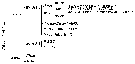 主要分為:單直平探頭法(含接觸法與液浸法)、單斜探頭法(接觸法用,包括 橫波、瑞利波、蘭姆波、爬波探頭)、單直聚焦探頭法(含接觸法與液浸法,點聚焦 與線聚焦)、單斜聚焦探頭法(接觸法用)、組合雙晶探頭法(含組合雙晶直探頭與 組合雙晶斜探頭)、雙斜探頭法、小角度單斜探頭法以及眾多的專用探頭檢測方法(例 如鐵軌專用探頭、小徑管焊縫探傷專用探頭,以及導(dǎo)波探頭、相控陣探頭)等等。
